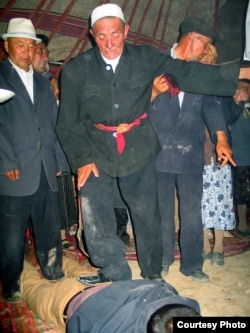 Даут Шомфай: Бакшы ооруп аткан, жин-шайтан кыйнаган же жинди болуп кеткен адамдарды бийге чакырып, тууну айлантып, аларды чапкылайт, камчы менен ургулайт, кээде жерге түшүрүп үстүнөн таптап, жин шайтанды чыгарабыз деп, ичиндеги жаман нерселерди кубалайт, бир убакта (жин-шайтан) чыгып кетет.