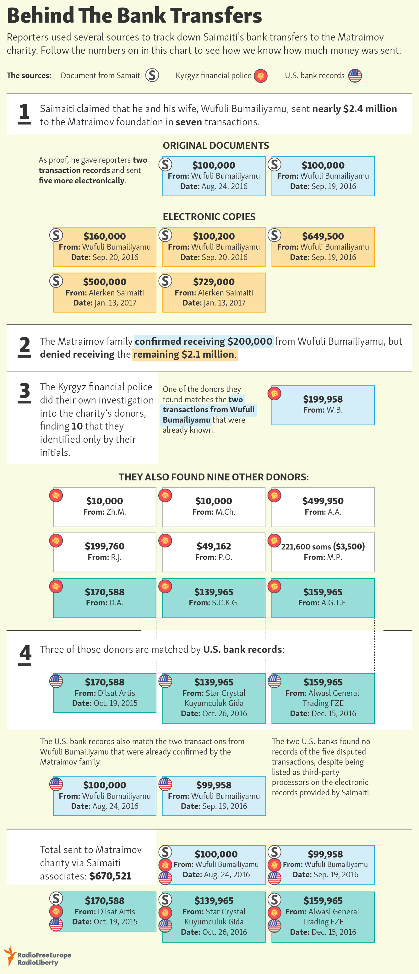 ТАБЛИЦАГА КОШУМЧА: Бул жерде Матраимовдордун фондуна Саймаити жана анын шериктери жөнөткөн беш акча которуунун тастыктамасы бар. Бул жерди бассаңыз, ар бир акча которуу майда деталдары менен өзүнчө бөлүнүп көрсөтүлөт.